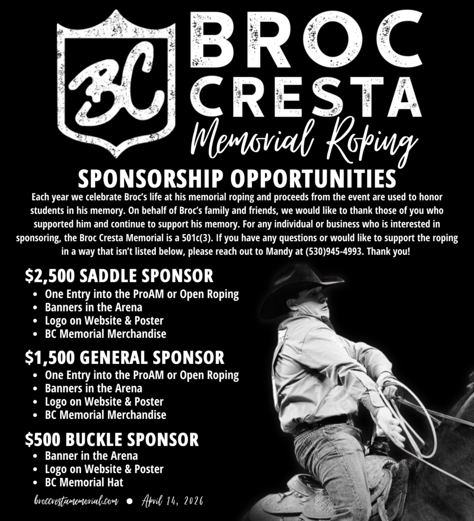 The 15th Annual Broc Cresta Memorial Pro-Am and Open Roping is April 13, 2027 at 9:00 AM!